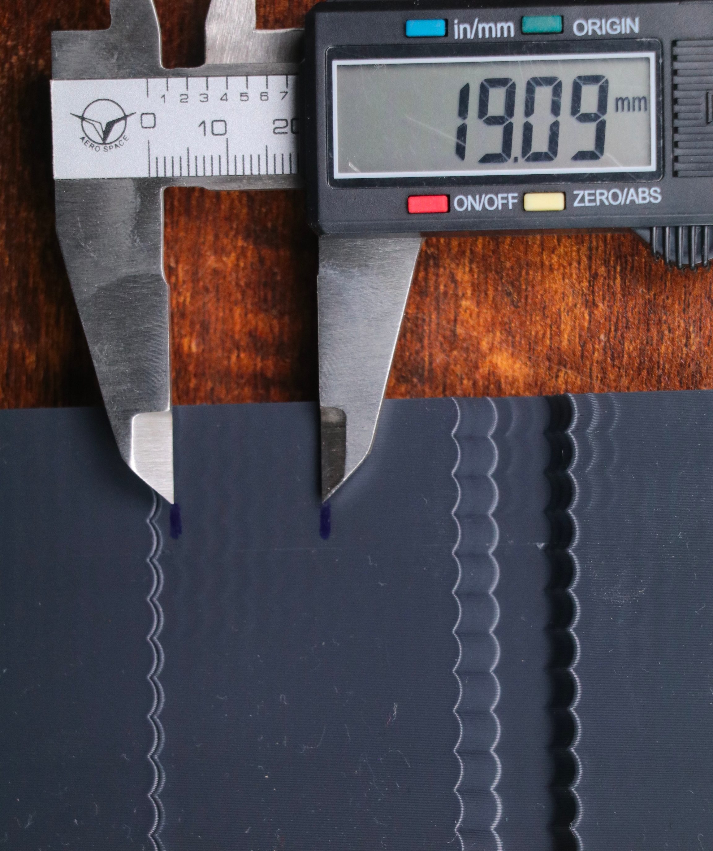 V es la velocidad que usamos en los perímetros externos. N es el número de oscilaciones medidas. D es la distancia entre ellas. A modo de ejemplo, para un test a 100mm/s, medimos 8 oscilaciones con una distancia de 19mm: 100*8/19= 42 Hz