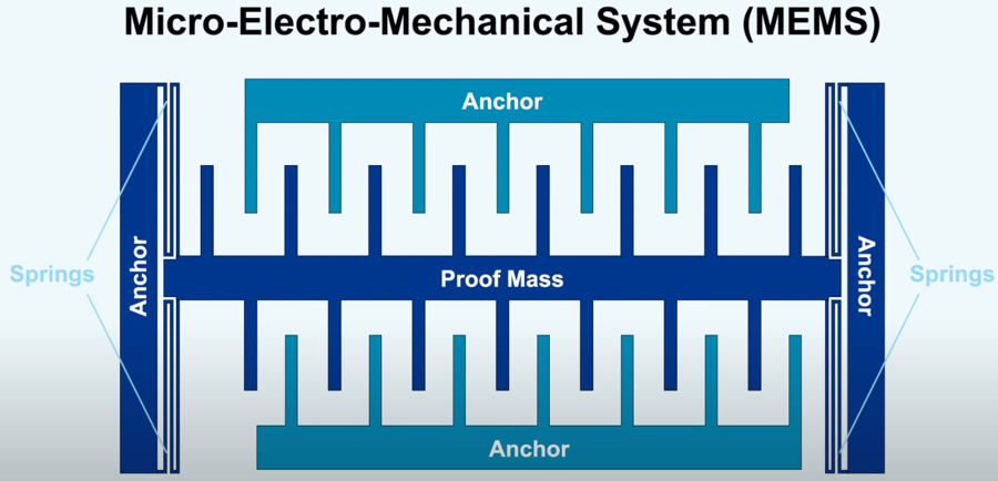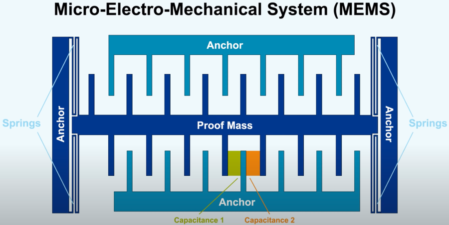 Normalmente se suelen usar acelerómetros MEMS (Micro Electro Mechanical System) dado que son precisos, fiables y baratos. Básicamente, tal como podéis ver las siguientes imágenes, es un peso montado en unos resortes mientras el otro es fijo normalmente en forma de peine: