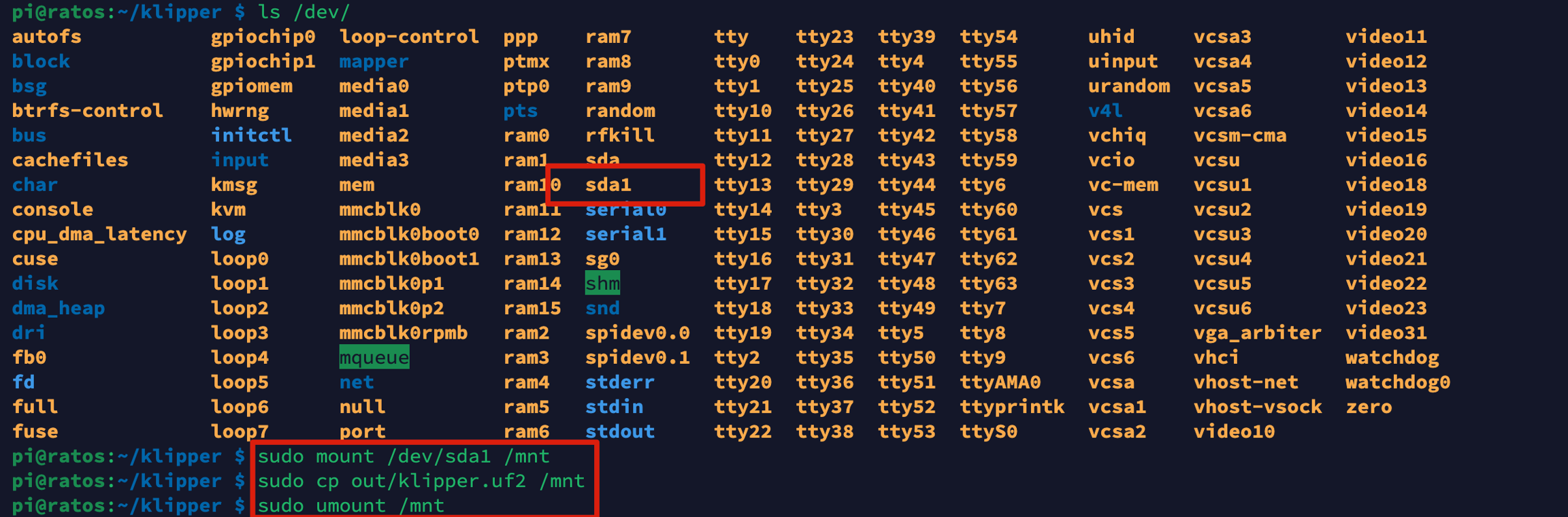 Conectaremos nuestra Fysetc Pico por USB a nuestra Raspberry Pi dejando presionado el botón de boot en la Pi Pico para que monte la unidad de boot y ejecutaremos lo siguiente: