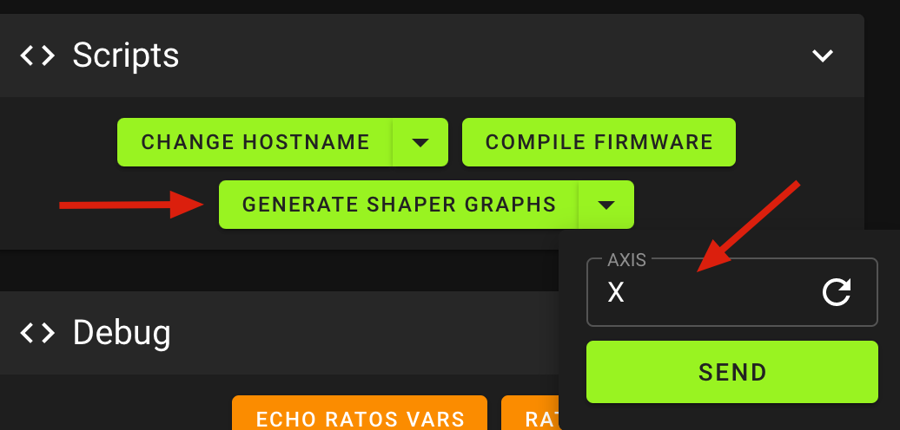 GENERATE_SHAPER_GRAPHS, lanzará el proceso de generar test de resonancias y las gráficas de input shaper para ambos ejes de forma automatizada (o de uno en concreto si así se lo indicas como parámetro) y nos dejara las imagenes dentro de la carpeta input shaper para poderlas bajar de forma cómoda desde nuestra UI
