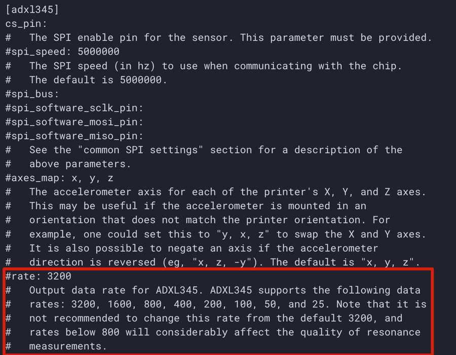 También, por compatibilidad con algunos sistemas como RatOS, ajustaremos la sección [adxl345] para añadir un identificador en nuestro caso usaremos fysetc para distinguirlo de otros posibles que podamos tener: