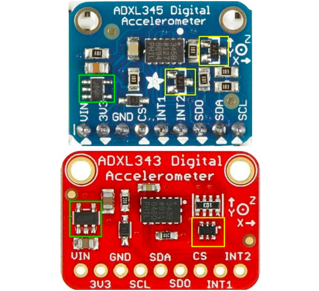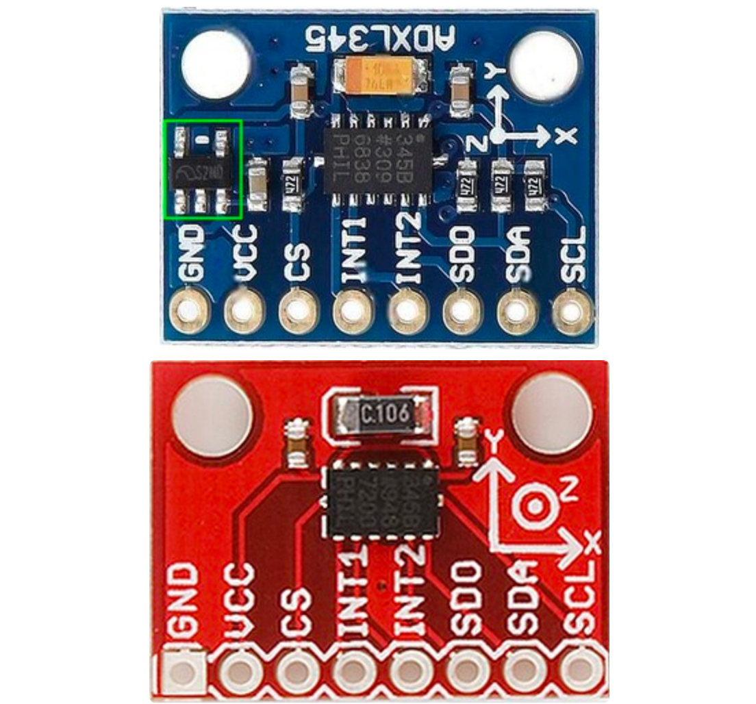 Regulador de Voltaje, estas placas pueden alimentarse tanto a 3.3v como 5v. El chip ADXL34X trabaja a 3.3v, pero en el caso de tener un regulador de voltaje permitirá que solo esos 3.3v lleguen al chip, independientemente de la alimentación que usemos Placas sin regulador de voltaje NO se deben de alimentar a 5v ya que puede/va a dañar nuestra placa.