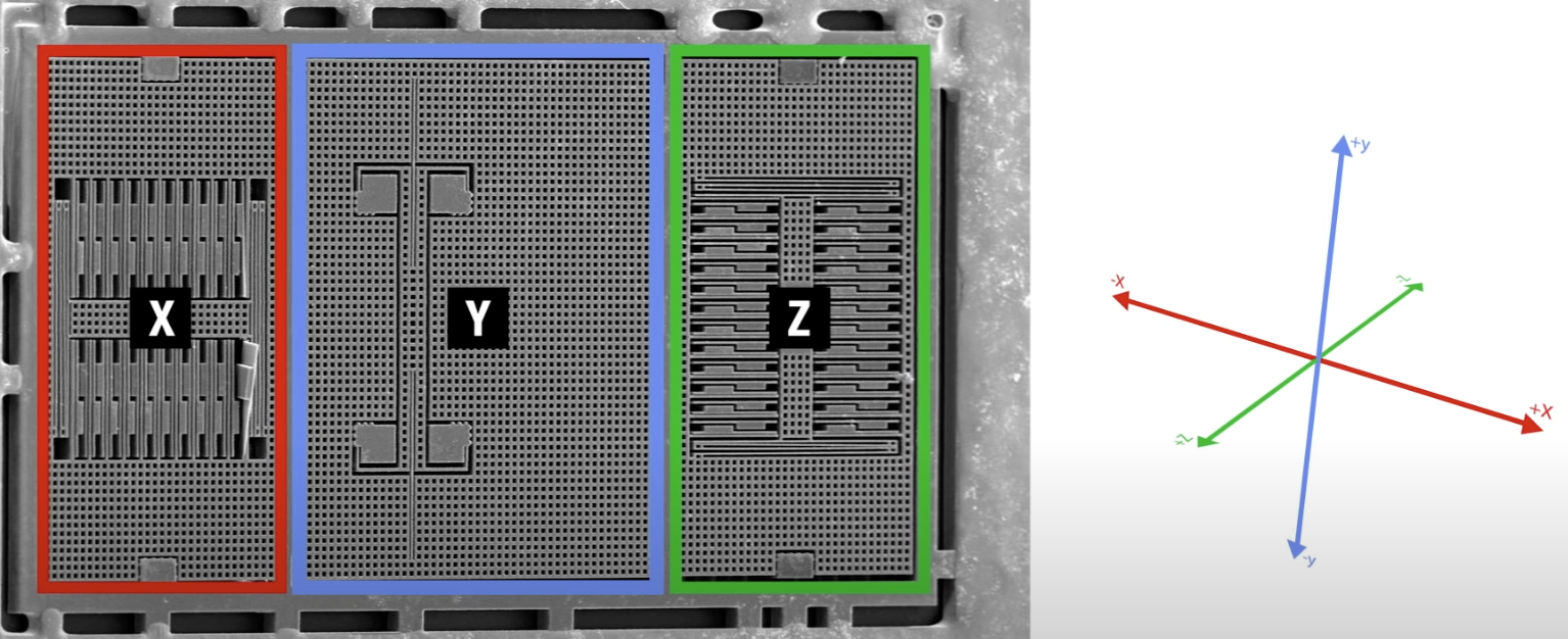 Por último y a modo de ejemplo tenéis una imagen de como sería internamente un acelerómetro de 3 ejes donde podréis ver lo anterior en el mundo real: