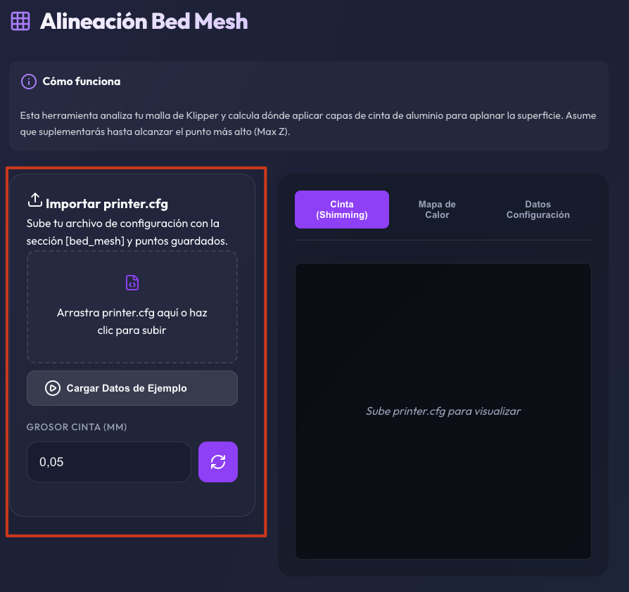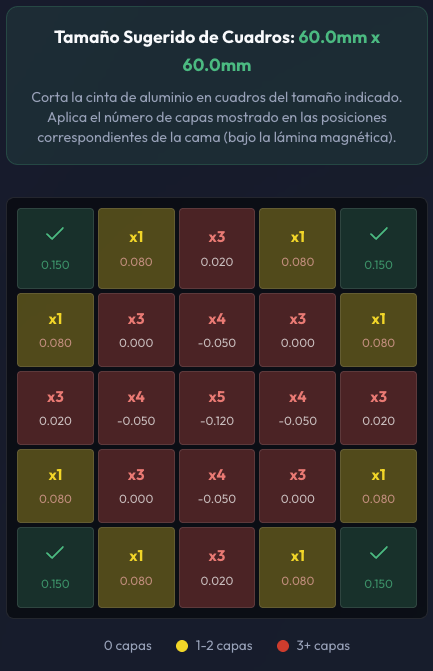 Para poder realizar estas compensaciones hemos creado una herramienta que simplemente exportando nuestro printer.cfg va a obtener la configuración de vuestra impresora y mallado actual y con el nombre **default**, que ha de ser fiable, y introduciendo el grosor de la cinta de aluminio que vayáis a utilizar (a menor grosor mejor ajuste fino) os va a proporcionar el número de cuadrantes a cubrir con x número de capas de cinta de aluminio.