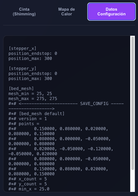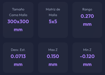Una vez cargado vuestro printer.cfg la herramienta os mostrará los datos obtenidos de esta como el tamaño de impresión XY, la matriz del mallado utilizado, y los rangos de desviaciones calculados:
