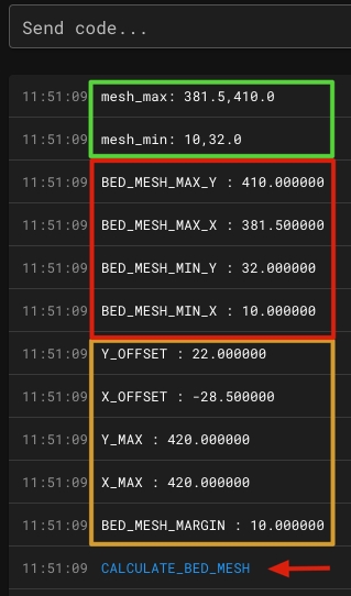 Si todo ha ido de forma correcta veremos en la consola información obtenida de nuestra configuración (recuadro naranja), los cálculos de coordenadas (recuadro rojo) y la sugerencia de configuración para nuestro [bed_mesh] en concreto los valores mesh_min y mesh_max (recuadro verde):