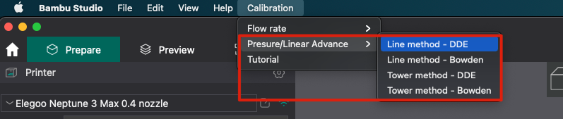 Nuestro laminador preferido OrcaSlicer dispone de un estupendo menú de calibración donde podemos generar en unos pocos clics un test de PA.