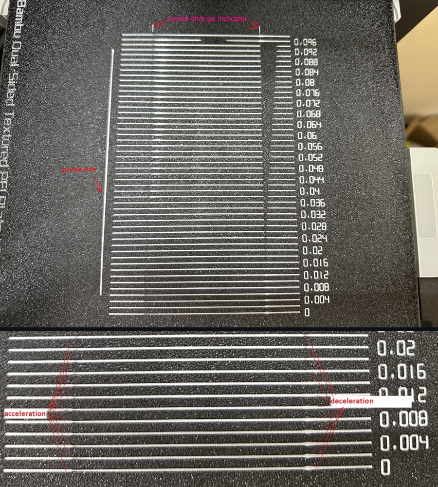 Estos tests imprimen un patrón de líneas donde, utilizando un valor de PA diferente en cada una de ellas, nos permite identificar la calidad de extrusión al hacer estas trazadas.