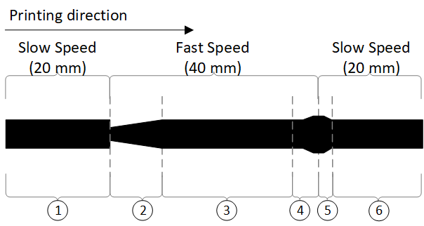 Al contrario que pasaba en la zona 2, en esta zona volvemos a un ajuste de velocidad lenta. La presión/flujo del nozzle es mayor con respecto a la desaceleración del cabezal de impresión. El resultado normalmente es un exceso de material en esta zona.