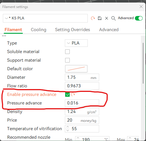 Otra forma alternativa y sugerida cuando usemos filamentos diferentes a los que usemos normalmente es añadir SET_PRESSURE_ADVANCE ADVANCE=<value> en el apartado gcode de filamento de PrusaSlicer/SuperSlicer, sustituyendo <value> por el valor obtenido en el test.
