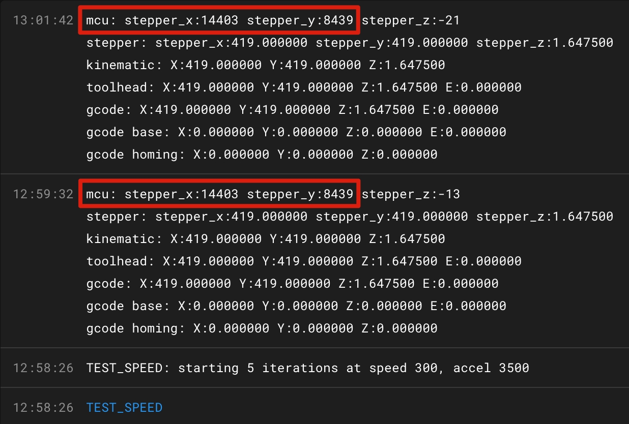 si estos valores varían más de un paso significará que nuestros ejes han perdido pasos y deberemos ajustar la velocidad máxima o ajustar nuestra configuración de corriente en motores, drivers o cinemática
