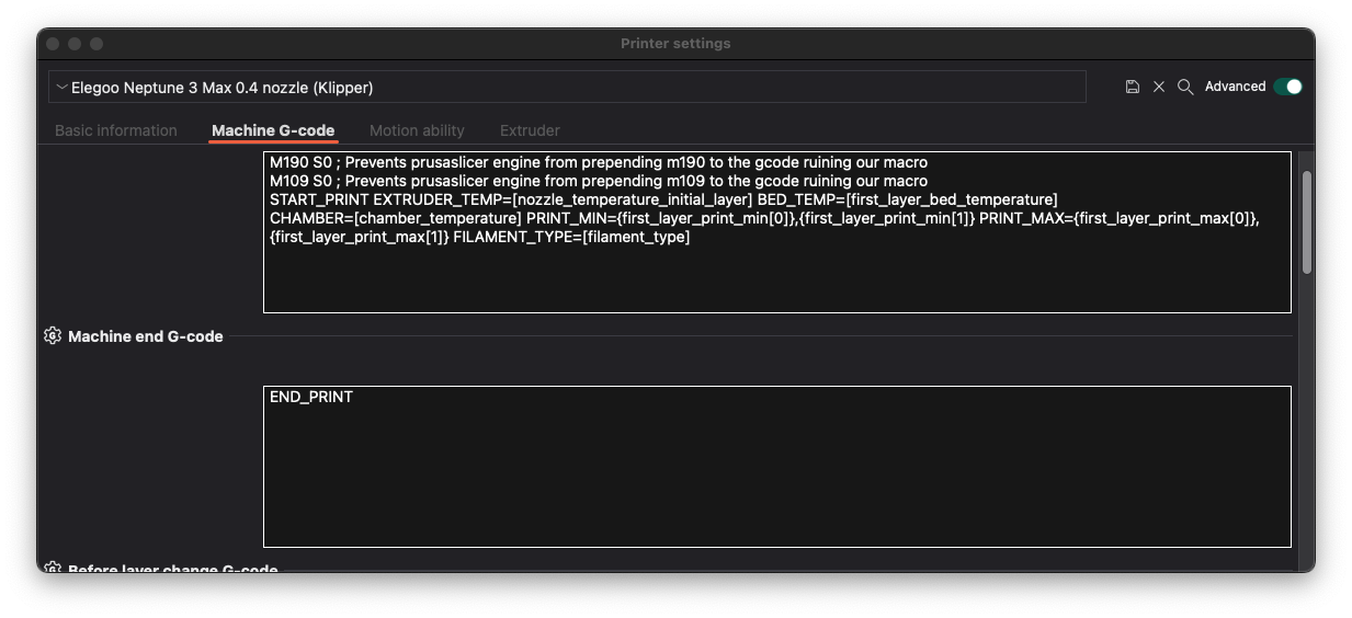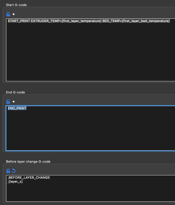 Macro de fin de impresión donde también disponemos de segmentación para poder personalizar nuestra macro. También contamos con aparcado dinámico del cabezal.
