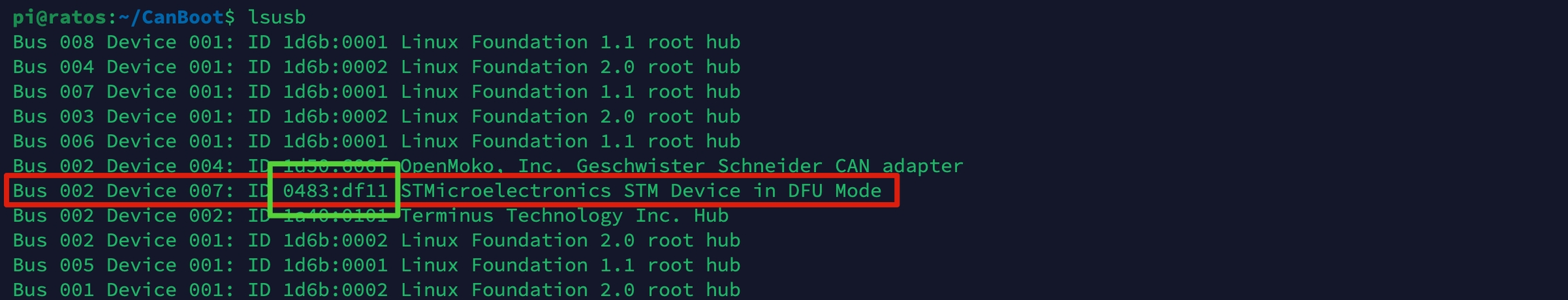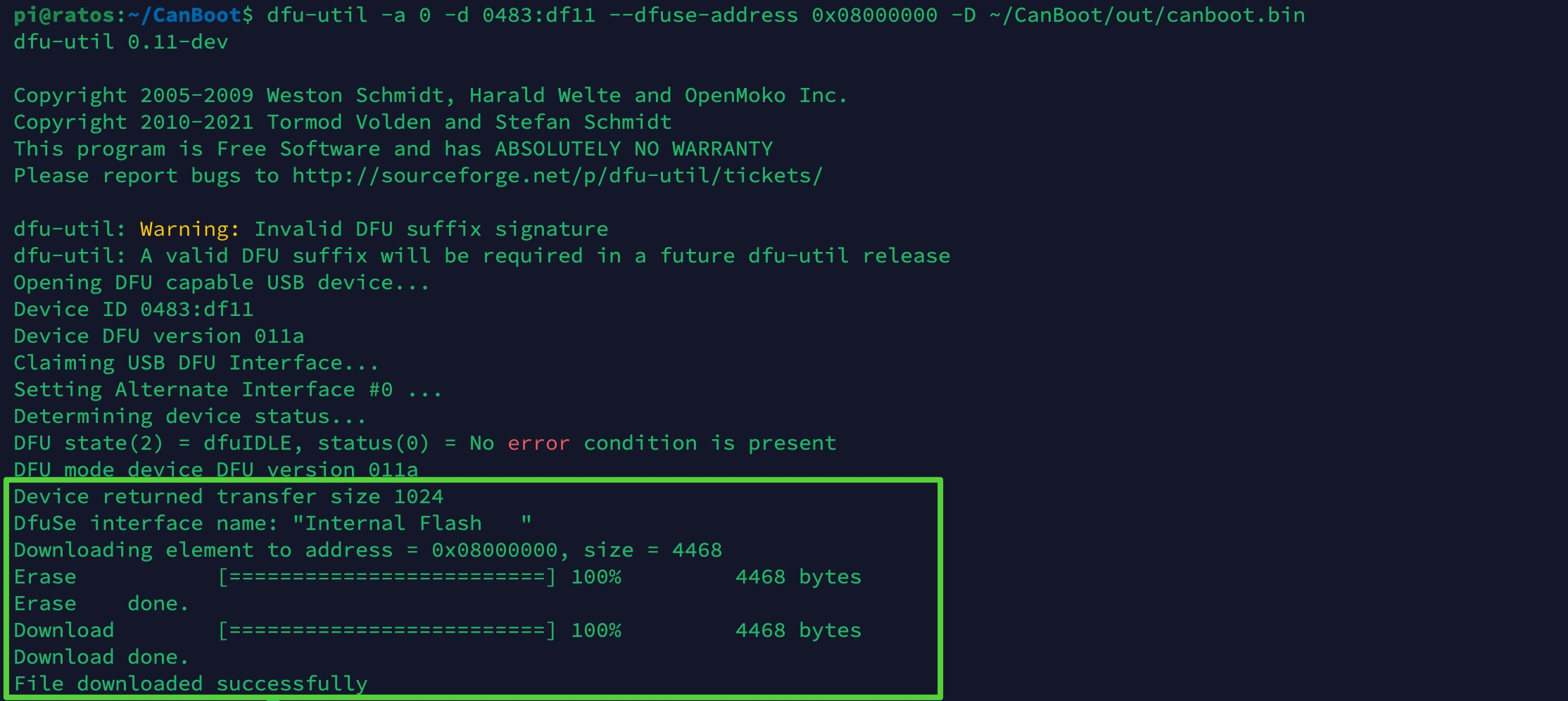 dfu-util -a 0 -d 0483:df11 --dfuse-address 0x08000000 -D ~/CanBoot/out/canboot.bin