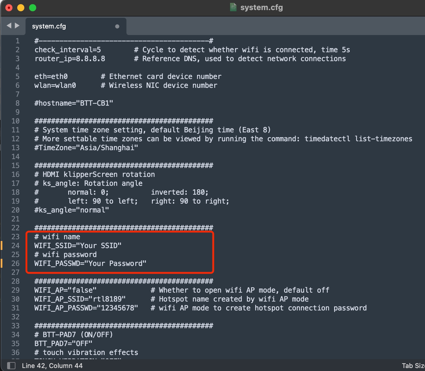 Abriremos nuestro system.cfg con un editor de textos, importante usar uno específico para programación como Notepad++, Visual Studio Code, Sublime... Y ajustaremos las configuraciones de nuestra WiFi. Básicamente, cambiaremos Your SSID por el nombre de nuestra red WiFi y cambiaremos Your Password por la contraseña que utilicemos en nuestra WiFi.