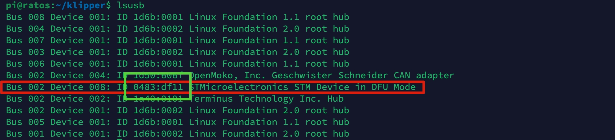 ya tenemos todo listo para aplicar el firmware Klipper en nuestra EBB, pondremos esta en modo DFU (presionando RST) y ejecutaremos lsusb para encontrar su ID