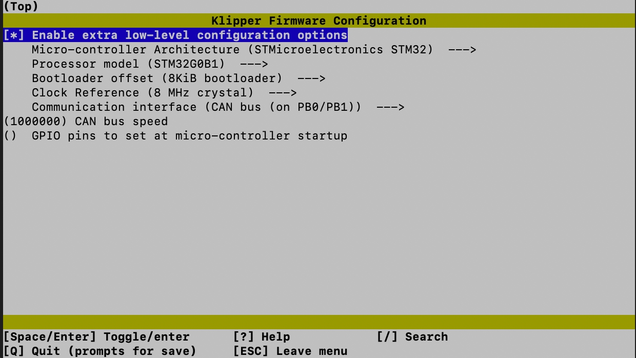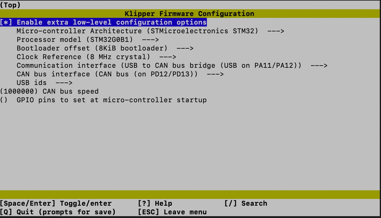 ahora prepararemos el firmware Klipper para nuestro EBB, para ello desde el terminal lanzaremos los siguientes comandos... ajustaremos las opciones como la imagen adjunta y presionamos Q para guardar los ajustes:
