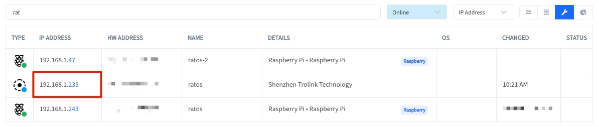 Para poder encontrar la IP de nuestra M8P podemos usar Fing que es una aplicación multiplataforma que nos escaneará y listará todos los dispositivos de nuestra red. Debería aparecer con el nombre de host BTT-CB1 (en el caso de utilizar la imagen CB1) o ratos (si utilizamos la imagen CB1 de RatOS).