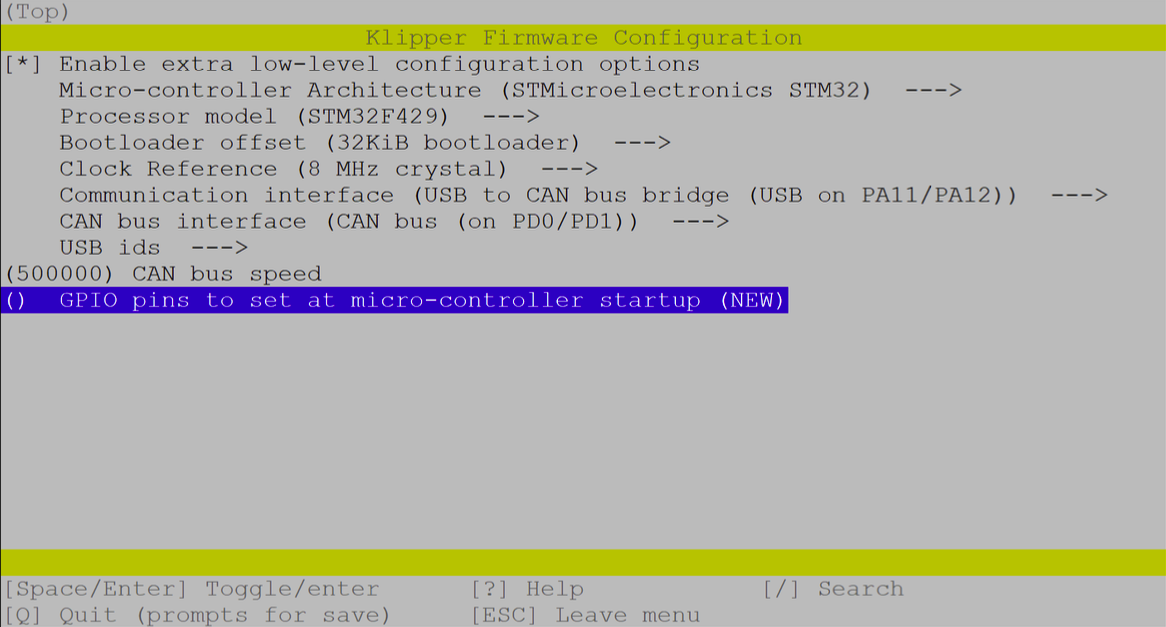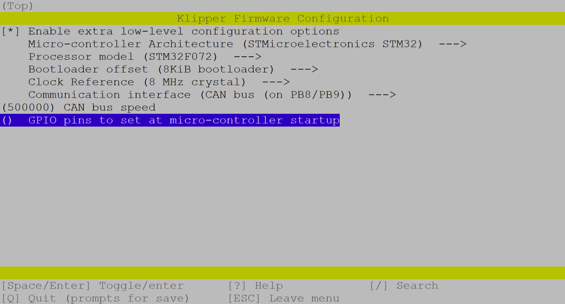 A la hora de generar el firmware Klipper usando como conexión CANbus asegúrate que seleccionas la velocidad correcta que usaste previamente al generar el fimware/bootloader CANboot. En el ejemplo usamos 500000 pero os aconsejamos hacer pruebas con 1000000.