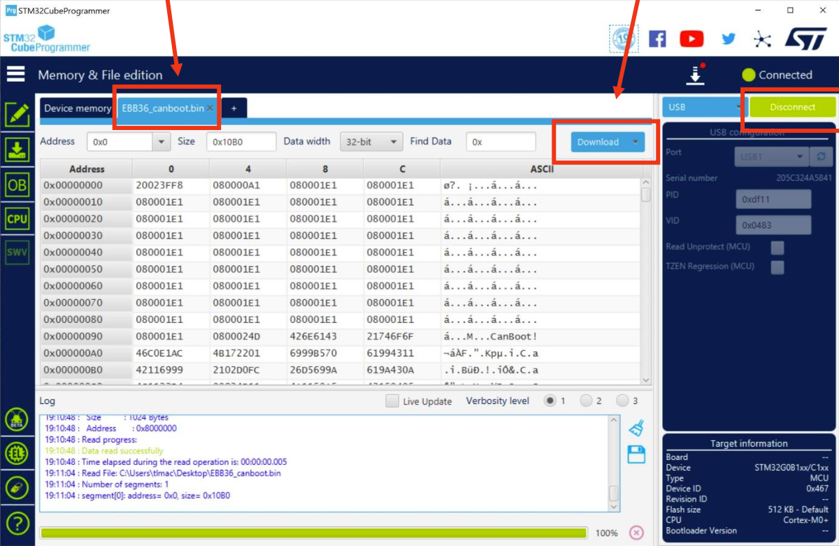 Conectaremos la EBB a nuestro ordenador y desde STM32CubeProgrammer realizaremos los mismos pasos que hicimos para nuestra Octopus.
