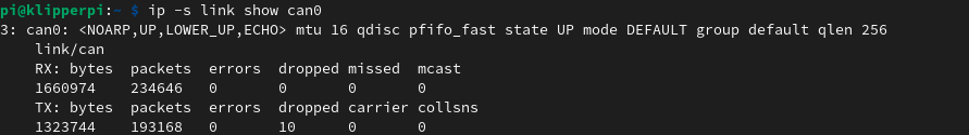Ahora que nuestra interfaz CAN vamos a revisar que esté levantado y funcionando con el comando, ip -s link show can0 en el caso de que diera un error podemos intentar levantarlo con sudo ip link set up can0 :
