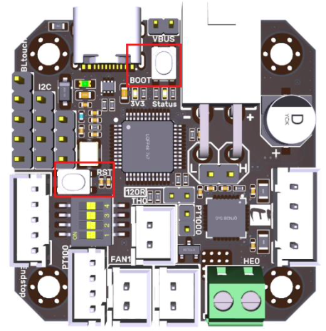 Aplicaremos alimentación a nuestra Octpus desde la fuente de la impresora y pulsaremos y soltaremos el boton RESET, esto hará que entre en modo DFU.
