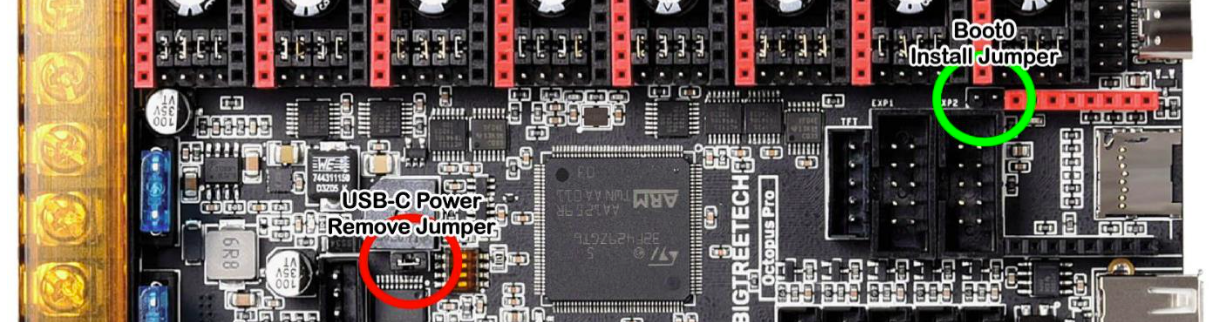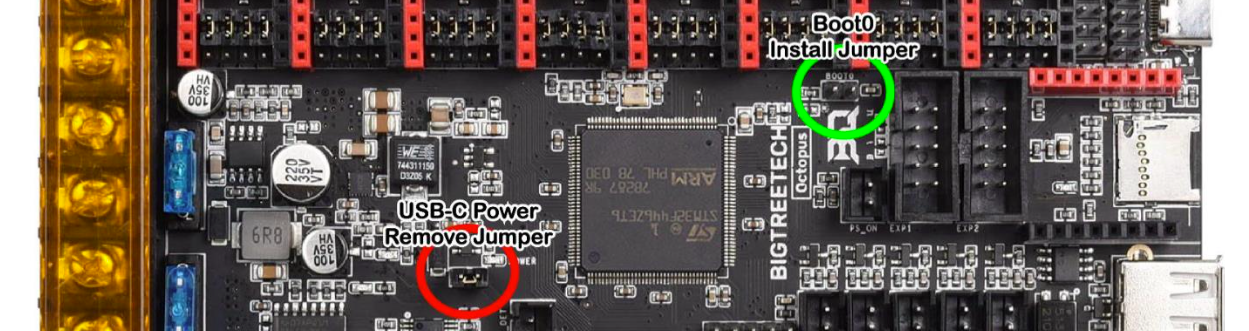 Quitaremos el jumper de los pines USB-C y pondremos un jumper en BOOT0