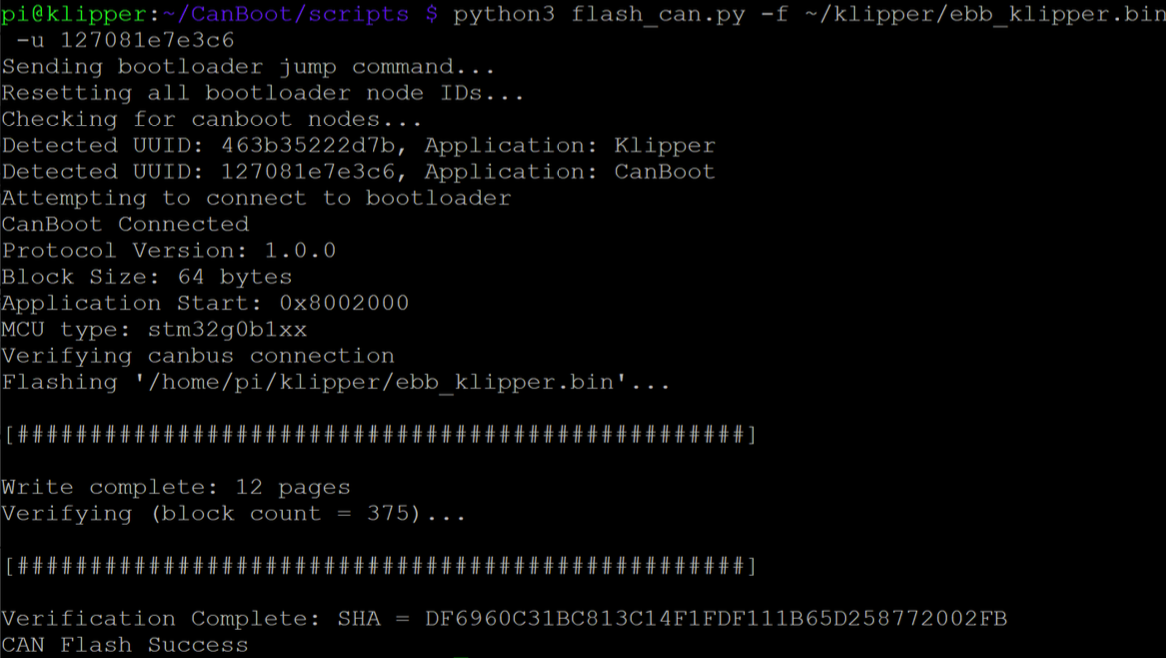 Ahora lanzaremos el comando para aplicar el firmware Klipper previamente creado para nuestra EBB usando la interfaz CAN: