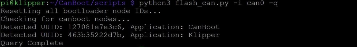 Podemos ver los UUID de nuestra Octopus con Klipper (463b35222d7b) y nuestra EBB en CANboot (127081e7e3c6).