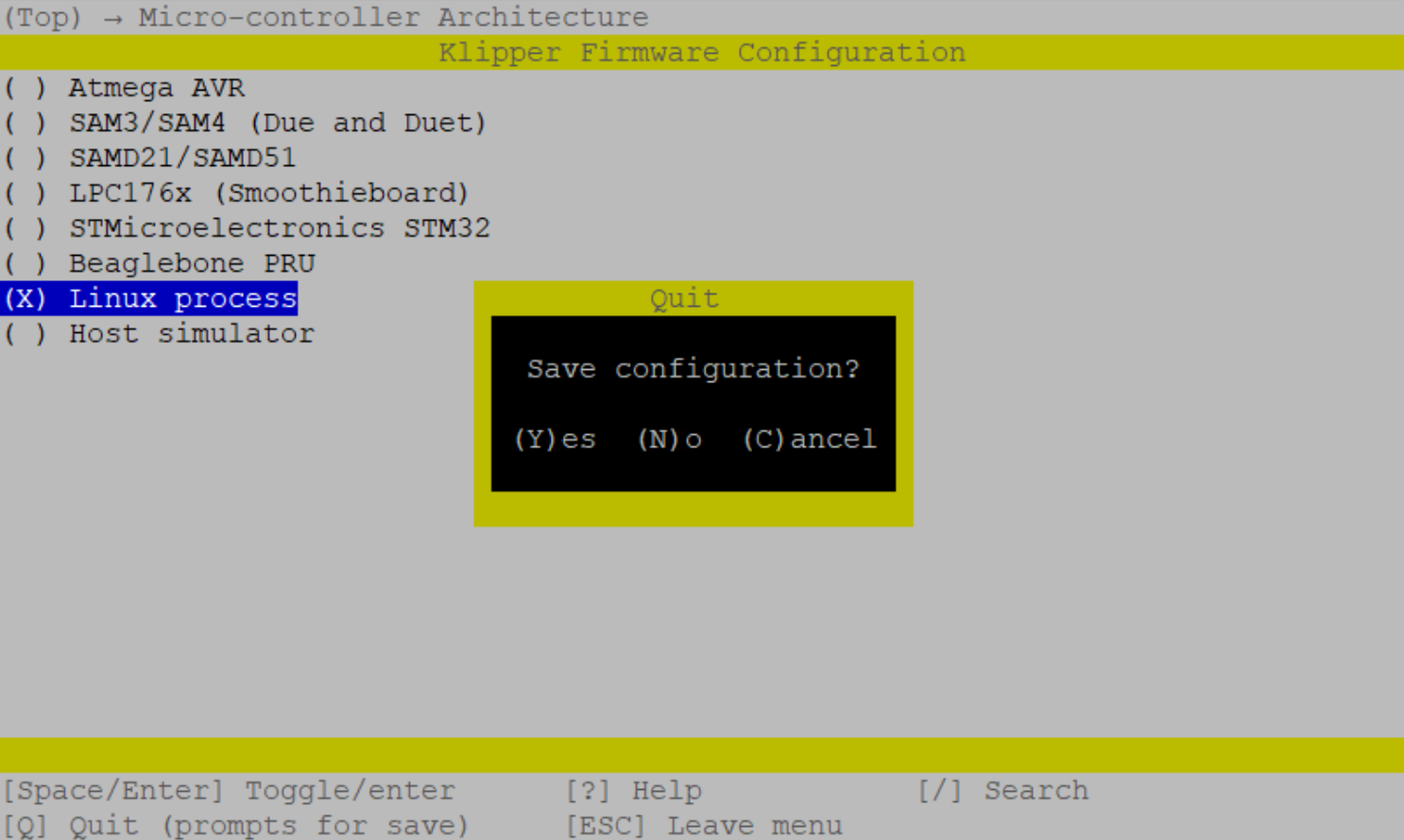 sudo systemctl enable klipper-mcu.serviceCrearemos nuestro firmware Klipper para nuestro Host, en las opciones iremos con las flechas a la opción Micro-controller Architecture y pulsando enter seleccionaremos de la lista Linux process una vez seleccionado pulsaremos Q e Y para confirmar: