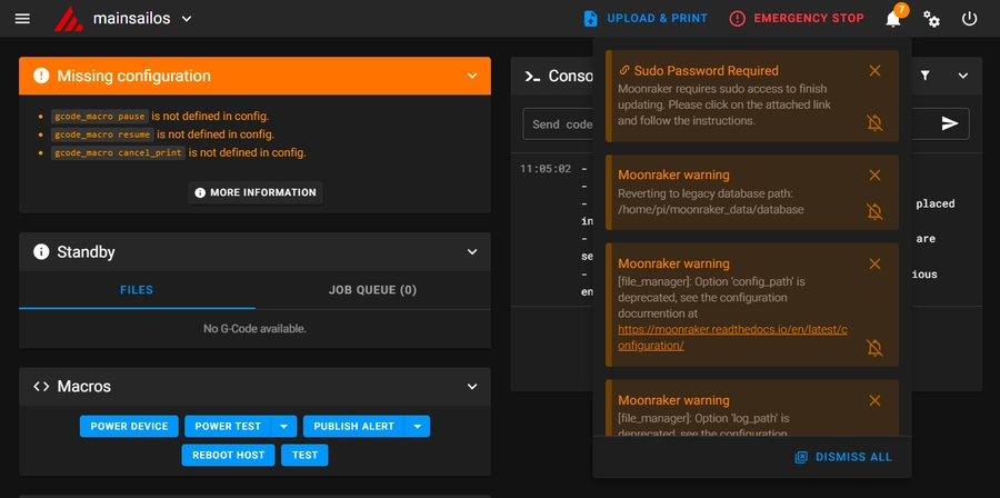 Un indicativo que tenemos este problema es que después de actualizar nuestra instalación de Moonraker esta no se comunica con Klipper, nos saltan varios errores o no tenemos acceso/permiso desde la UI a nuestros ficheros de configuración o alguna de las funciones relacionadas.
