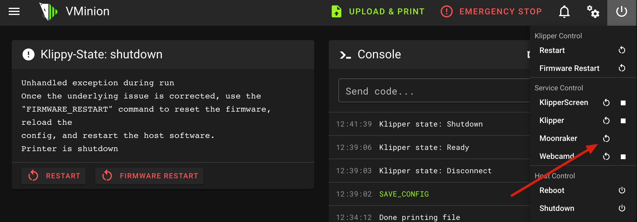Para reiniciar el servicio Moonraker podemos hacerlo de diferentes formas: